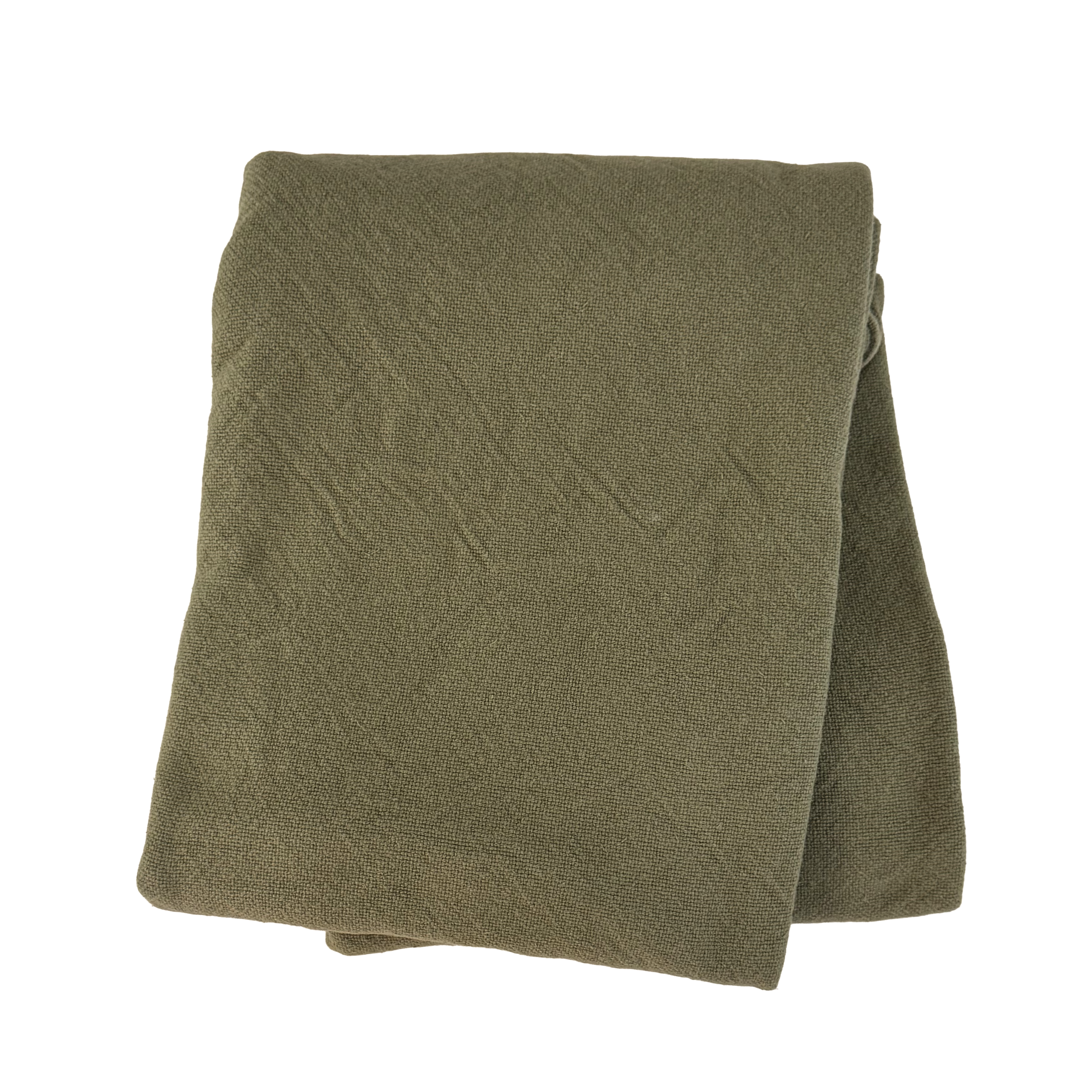 This is a plain weave loom woven blanket that has been garment dyed to an earthy olive green.
