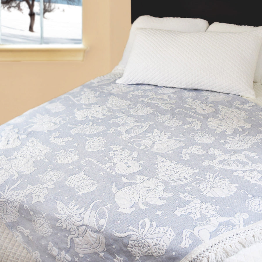 Indulge in the warmth of our Tinsel & Twine Throw, a cozy tribute to the magic of vintage holiday wrapping paper. With playful scenes of kittens tumbling over ribbons, and a charming rocking horse, this throw brings to life the whimsy and joy of childhood memories. It’s the perfect companion for anyone who loves to curl up and revisit the wonder of past holiday seasons.